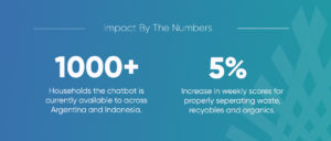 Results from pilot groups indicate that customers who signed up to receive chatbot nudges had 5% better weekly sorting scores compared to control groups over a 6-month period. This was driven by the behavior change campaigns sent through the chatbot, with the improvements in waste separation helping sorting centers achieve better efficiency with incoming waste, ultimately leading to more sales of recyclable material. We believe the chatbot will also help citizens feel engaged and result in them having a more positive waste management experience.